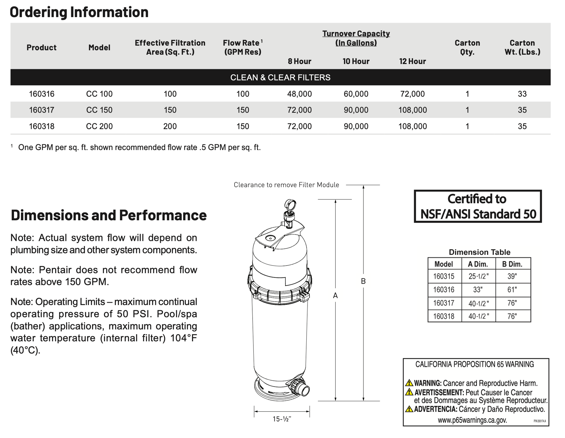 Technical specifications for Pentair Clean & Clear® Filters (common models, standard line):